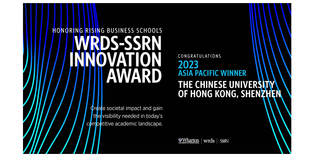 “This award recognizes the caliber of innovative and impact-focused research taking place at The Chinese University of Hong Kong, Shenzhen,” said Robert Zarazowski, Managing Director of WRDS. “WRDS is delighted to support the work taking place at the University and their commitment to growth in business education.” A part of the Wharton School of the University of Pennsylvania, WRDS advances comprehensive thought leadership and elevates the level of academic research to drive societal impact.