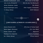 Chinese actor Zhang Yi and five actors from five different countries, including Denzel Washington, Benedict Cumberbatch, John Arcilla, and Suriya, compete for Best Actor. Kristen Stewart, Jessica Chastain, Maren Eggert, Penelope Cruz, and Moon So-ri vie for Best Actress.
