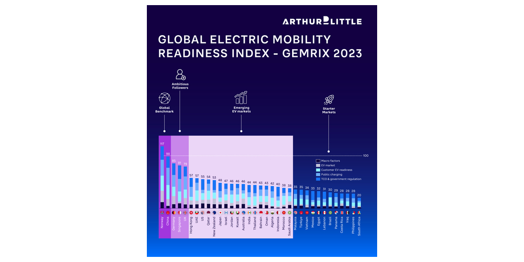 LONDON–(BUSINESS WIRE)–Arthur D. Little (ADL) today released its 2023 Global E-Mobility Readiness Index (GEMRIX), which has measured progress toward preparedness for electric vehicle (EV) adoption in 35 countries across all continents. The most recent edition of the index finds that overall progress has accelerated since 2022, as more and more countries have introduced measures to electrify road transport.