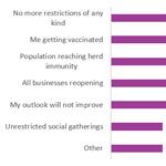 In April, the research found that more than one quarter (26 per cent) of Australians reported that their outlook would be helped by there being no more restrictions of any kind, followed by 23 per cent of employees� outlook being influenced by getting vaccinated against COVID-19 and 15 per cent of employees� looking forward to the population reaching herd immunity. These groups also reported the most favourable mental health scores (-7.4, -7.6 and -8.7, respectively).