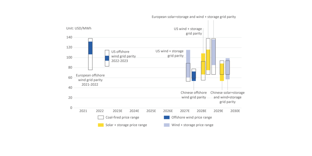 Energy storage costs will decline markedly as international cell manufacturers expand capacity. Cells currently account for a large portion of the total production cost of ESS, and the EV sector’s substantial cell demand keeps cell prices elevated. During 2028-2029, solar-plus-storage and wind-plus-storage will reach grid parity.