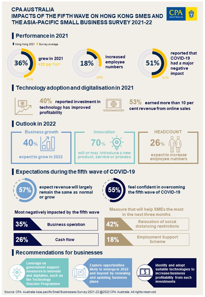 In light of the fifth wave of COVID-19 in Hong Kong, CPA Australia conducted a poll of SMEs in mid-March on their current and expected performance. This was a follow-up to a more in-depth survey of Asia-Pacific small businesses in November and December, which focused on the characteristics of high growth small businesses, business confidence and access to finance.