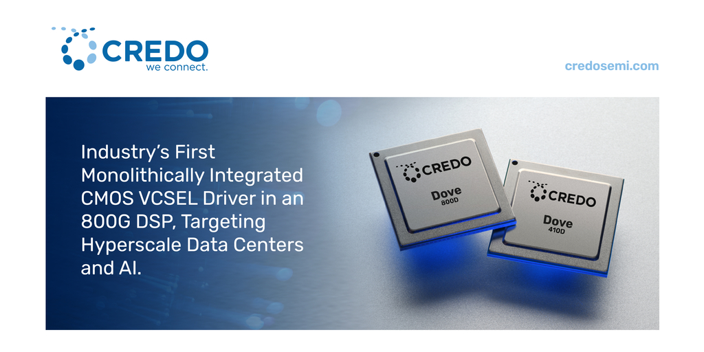 SAN JOSE, Calif. & SHENZHEN, China–(BUSINESS WIRE)–Credo Technology Group Holding Ltd (NASDAQ: CRDO) today introduced the new Dove 800D and 410D PAM4 DSPs ICs to accelerate time-to-market and address the increasing bandwidth requirements of hyperscale customers, AI backend clusters and general compute applications. These 8x100G and 4x100G per lane devices incorporate VCSEL drivers and fourth generation DSP technology which combined, creates an optimized, high-performance, small footprint solution that meets the increasingly stringent energy efficiency requirements of hyperscalers. The Dove 800D and 410D DSPs are tailored for multimode optical fiber (MMF) applications.