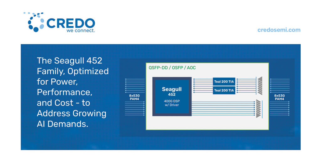 “With the massive growth of AI as predicted by the market forecasters, we see a tremendous opportunity to grow our footprint with customers, including hyperscalers, as the number of optical interfaces required to meet the AI workload flow will only continue to increase,” said Michael Girvan Lampe, Vice President of Worldwide Sales and Marketing at Credo. “Hyperscalers supporting AI applications will need to balance this growth demand for new levels of performance with capex and energy concerns. The Seagull 452 family of DSPs aims to help our customers balance these concerns while also benefitting from this growing market opportunity.”