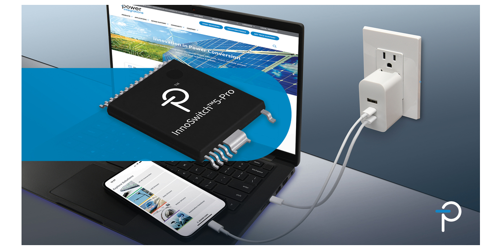 SAN JOSE, Calif.–(BUSINESS WIRE)–#GaN—Power Integrations (NASDAQ: POWI), the leader in high-voltage integrated circuits for energy-efficient power conversion, today announced the release of the InnoSwitch™5-Pro family of high-efficiency, programmable flyback switcher ICs. The single-chip switcher achieves over 95 percent efficiency with a novel secondary-side control scheme which achieves zero-voltage switching (ZVS) without a dedicated and costly additional high-voltage switch. The new IC, which features a 750 V or a 900 V PowiGaN™ primary switch, primary-side controller, FluxLink™ isolated feedback and secondary controller with an I2C interface, optimizes the design and manufacture of compact, highly efficient single- or multi-port USB PD adapters. Applications are notebooks, high-end cellphones and other portable consumer products, including designs that require the new USB PD EPR (Extended Power Range) protocol.