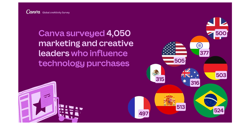 Canva commissioned Morning Consult to survey 4,050 business leaders in marketing and creative roles. These individuals are decision-makers for purchasing software in their department or company. Specifically, Canva surveyed 505 business leaders in the United States, 500 in the United Kingdom, 513 in Spain, 503 in Germany, 497 in France, 524 in Brazil, 315 in Mexico, 377 in India, and 316 in Australia.