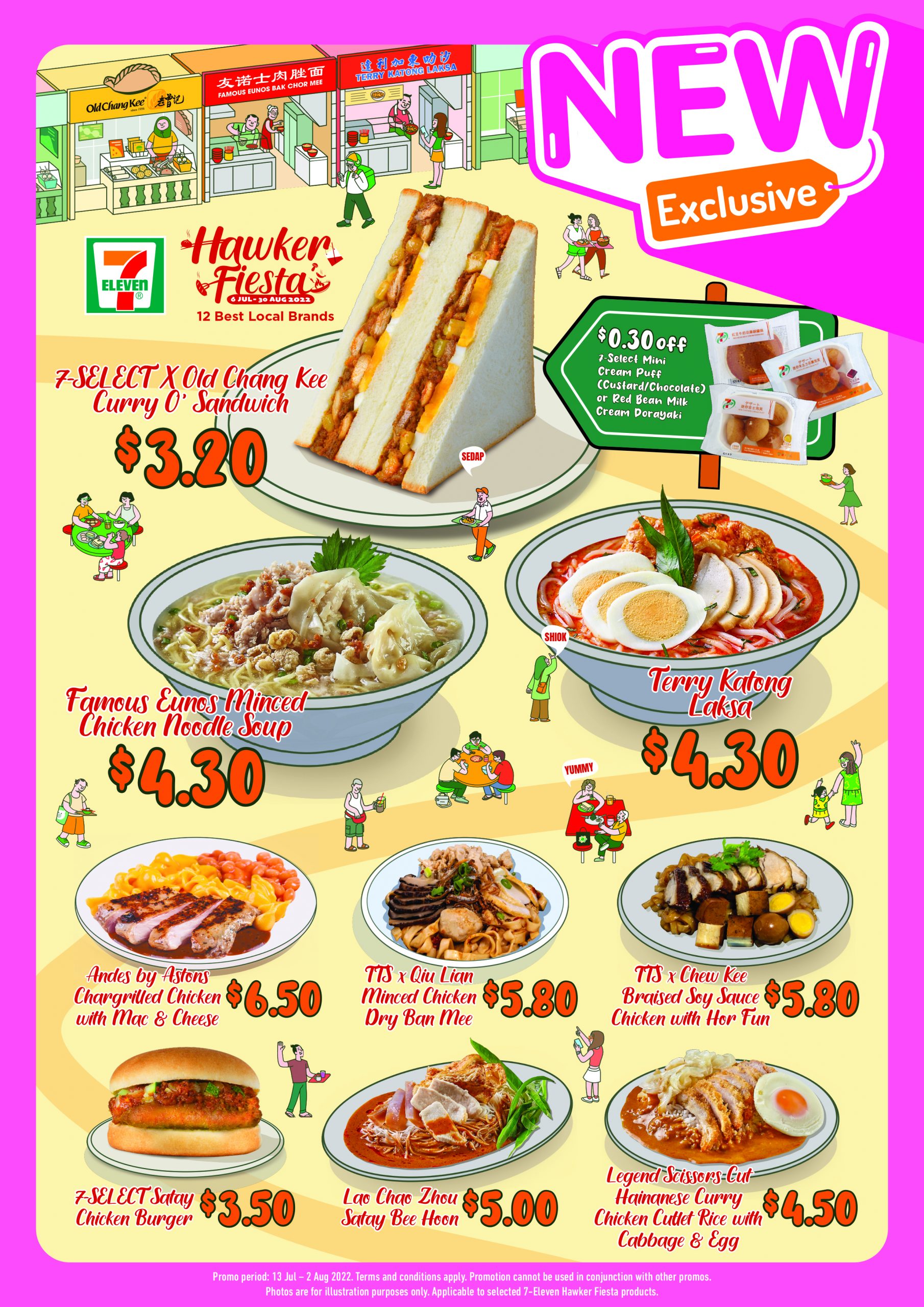 *Products include: 7-SELECT X Old Chang Kee Curry O’ Sandwich, 7-SELECT Chicken Satay Burger, Terry Katong Laksa, Famous Eunos Minced Chicken Noodle Soup, Lao Chao Zhou Satay Bee Hoon, Legend Scissors Cut Curry Rice with Chicken Cutlet, Cabbage & Egg, TTS x Qiu Lian Minced Chicken Dry Ban Mian, TTS x Chew Kee Braised Soy Sauce Chicken with Hor Fun, Andes by Astons Chargrilled Chicken with Mac & Cheese.