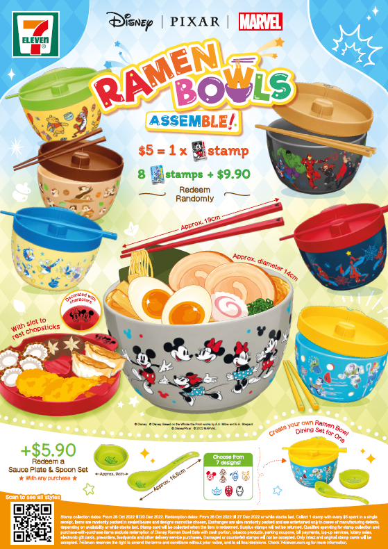 SINGAPORE – Media OutReach – 20 October 2022 – Disney fans can once again look forward to an exciting collaboration between 7-Eleven and Disney through its latest Shop and Earn Stamps programme! Coming to town is a limited-edition collection of 7 Ramen Bowls, featuring characters from Walt Disney, Pixar, and Marvel. Whether you want to satiate your late-night noodle cravings or enjoy a hearty rice bowl for lunch, these functional ramen bowls can be your go-to! They are exclusively available for redemption at all 7-Eleven stores islandwide from 26 October.