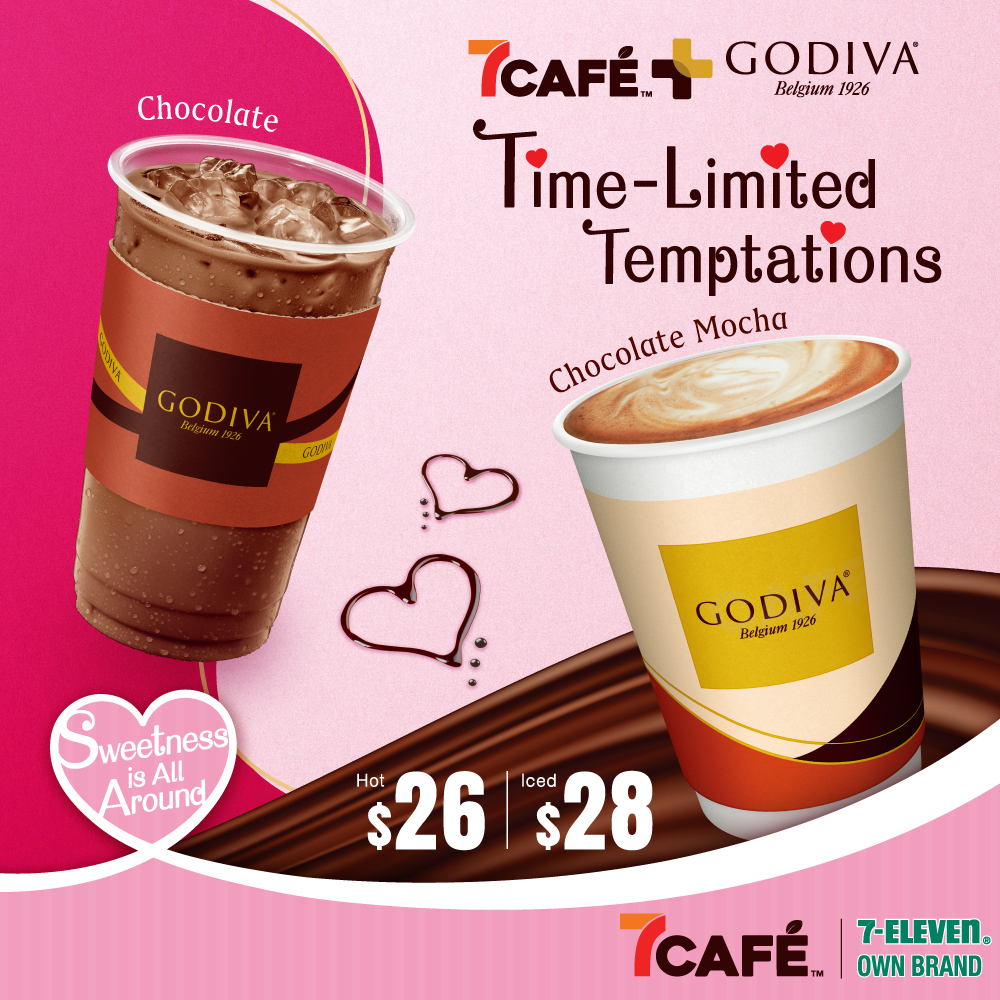 | 7CAFÉ+GODIVA Chocolate (Hot $26/Iced $28) Luxuriously indulgent, this silky-smooth chocolate drink is made with rich GODIVA cocoa powder and fresh milk. A creamy, chocolatey creation that will definitely put a smile on your face! |