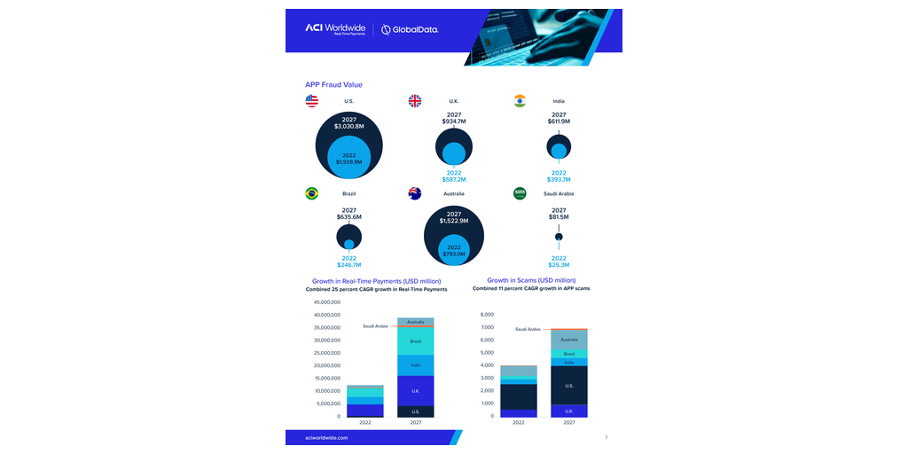 MIAMI–(BUSINESS WIRE)–Authorized Push Payment (APP) scam losses are on the rise and expected to climb to $6.8 billion — a combined compound annual growth rate (CAGR) of 11% — by 2027 across six leading real-time payment markets (U.S., U.K., India, Brazil, Australia and Saudi Arabia) according to Scamscope, a new report by global payments software company ACI Worldwide and GlobalData, a leading global analytics firm. During the same period, the overall value of real-time transactions is also forecasted to grow at a faster pace, reaching 25% CAGR.