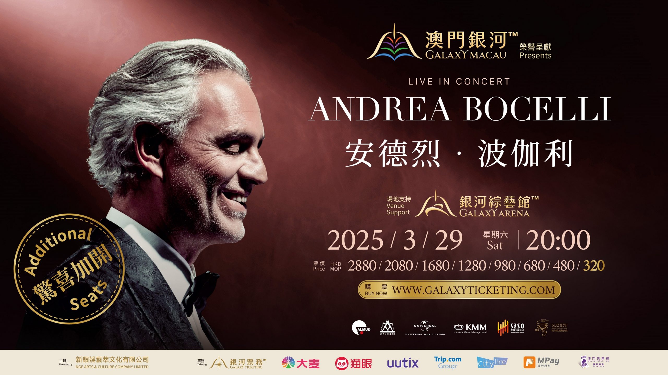 MACAU SAR – Media OutReach Newswire – 20 March 2025 – Galaxy Macau™ proudly presents the inaugural solo concert of Andrea Bocelli in Macau. The globally celebrated “Voice of God” will take the stage at the Galaxy Arena, Macau’s largest indoor venue, on March 29 at 8 PM. This highly anticipated event has sparked a rush for tickets since their release, and today, the organizer was excited to offer a limited number of seats priced at MOP 320. Tickets are available through Galaxy Ticketing, Damai, Maoyan, uutix, Trip.com, Ctrip, MPay, and Macau Ticket, providing fans with a final opportunity to experience the brilliance of the “Voice of God.”