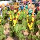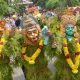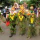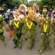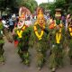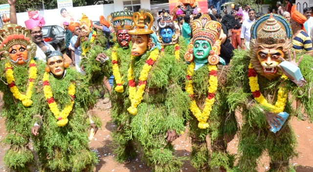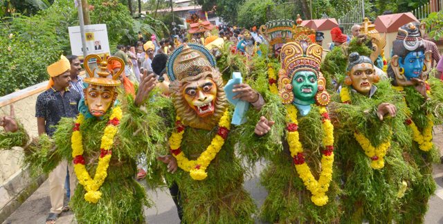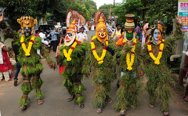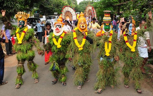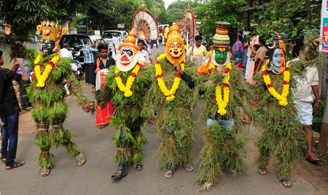 During the festival of Onam, Kummattikali performers move from house to house collecting small gifts and entertaining people. Kummatti dances are rampant in the Thrissur district during Onam.The dancers wear skirts woven out of plaited grass. Some cover their whole body with bunches of grass for a more bushy appearance. Dancers also hold and manipulate long sticks of residuary agricultural produce called ‘Kummattikali’: it is from this that the dance derives its name. Their dance is related to Shaiva myth. ‘Thamma’ (an old woman) walks in front with the help of a stick. Thamma is symbolic of mother of every being and everything.