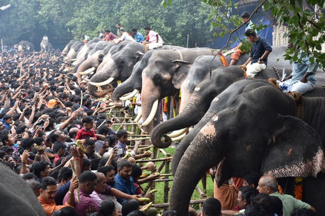 It involves a number of unadorned elephants being positioned amid a multitude of people for being worshipped and fed.