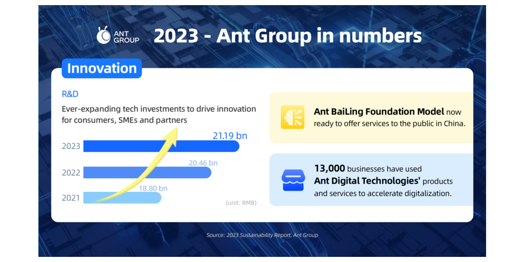 To drive innovation for consumers, small and micro-sized enterprises (SMEs) and partners, Ant Group has increased its investment in technology R&D for three consecutive years, reaching a record high of RMB 21.19 billion yuan (~ 2.92 billion USD) in 2023. Ant Group’s BaiLing Foundation Model, which was approved to serve the Chinese public in 2023, has been powering AI assistants that make it easier for users to access various life services on the Alipay platform, from smart life assistant, to smart healthcare manager and smart financial manager.
