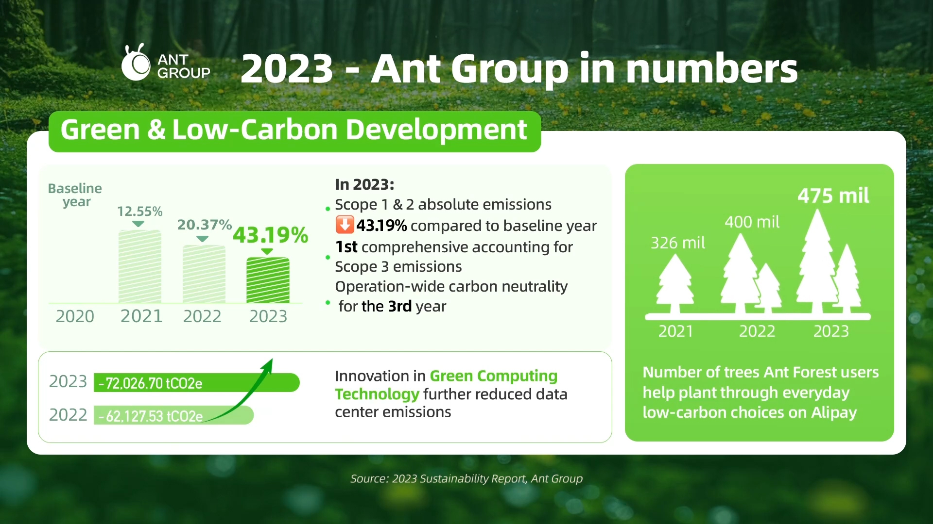 Note: All figures are as of December 31, 2023 unless otherwise specified. The 2023 Sustainability Report is available in Chinese. The English-language version will be available on Ant Group’s official website soon.