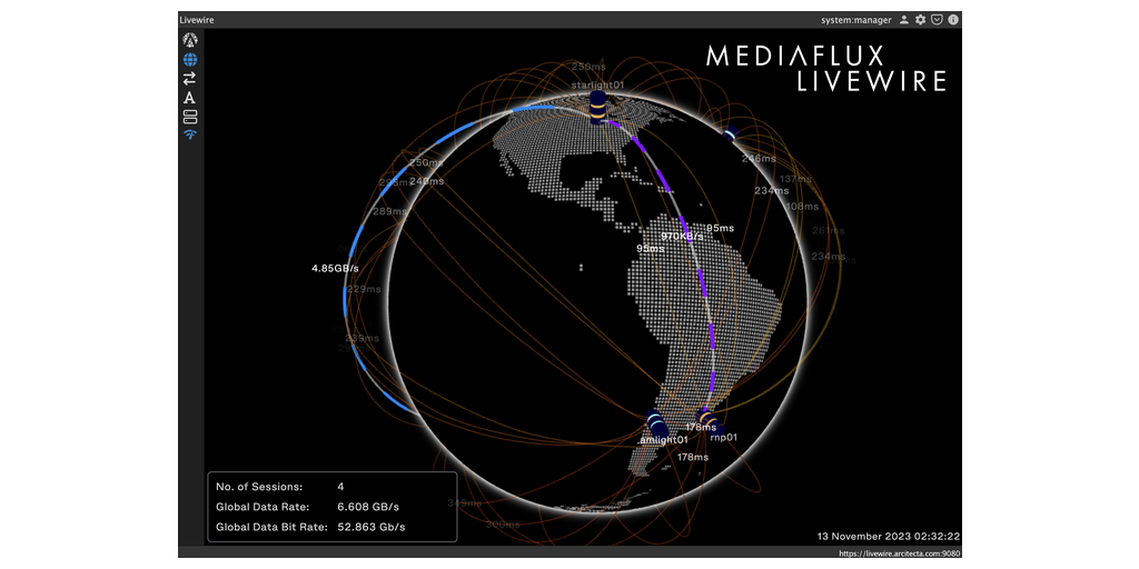 Using parallel TCP/IP protocols to minimize network administration overhead, Livewire can be deployed as a stand-alone solution to directly replace other network transmission tools. With these enhancements, the system can scale from the smallest and most unreliable networks to networks of hundreds of gigabits to terabits per second. Livewire is integrated within the Mediaflux metadata-driven ecosystem, allowing all Mediaflux systems and capabilities to seamlessly work together across different network topologies. Users and systems can leverage the power of metadata to orchestrate the flow of data around the globe securely. Mediaflux knows exactly where all data is located and who transmitted the data. This global visualization of data flows is unique to Mediaflux and highlights Arcitecta’s expertise in geospatial data management and ability to deliver a view of all data presence points.
