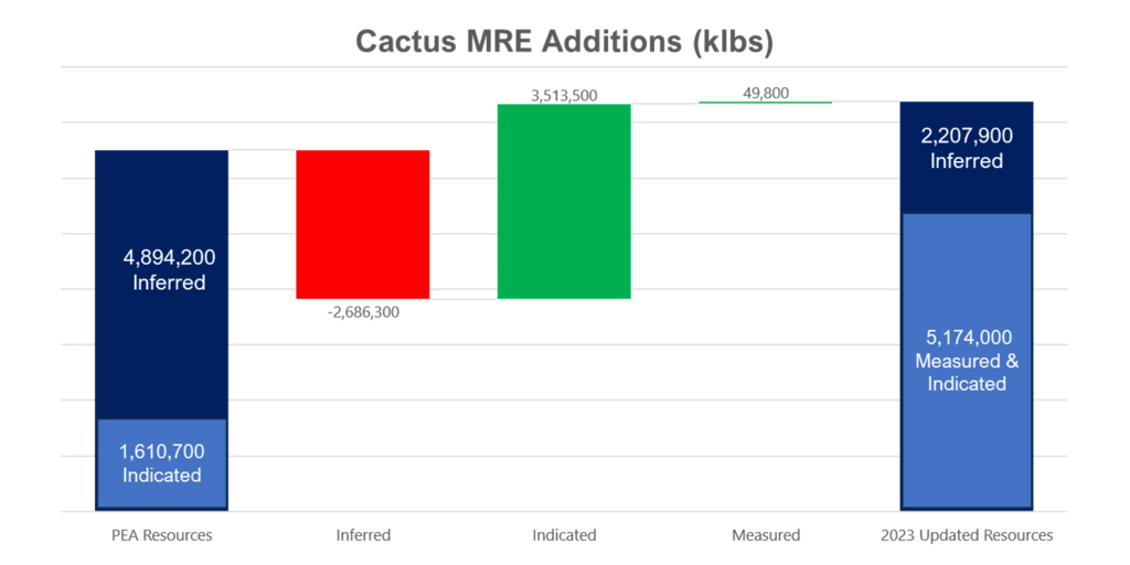 Measured and Indicated drilling programs at the Cactus Deposits (TABLES 3 and 4) were focused on upgrading Inferred mineral resources from the PEA mine plan to support the PFS. The total M&I leachable resources reported for the Cactus deposits of 156.3Mt @ 0.491% Cu TSol are located within the combined open pit and underground mineral resources. Of this material, Cactus East contains 41.2Mt @ 1.057% Cu TSol of leachable M&I mineral resources when reporting above underground cutoff grades. Reductions of the underground inferred resources reflect additional material incorporated into the open pit indicated resources.
