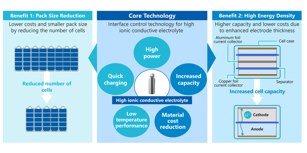 Asahi Kasei is a pioneer in the field of lithium-ion battery research and battery material manufacturing. Asahi Kasei began developing an electrolyte with high ionic conductivity in 2010, when Honorary Fellow Akira Yoshino2 focused on acetonitrile as a promising ingredient in lithium-ion battery electrolytes. By using the high ionic conductive electrolyte, it is possible to reduce batteries pack size while maintaining the power output, contributing to higher battery energy density and lower overall pack cost. The projected benefits are shown in graphic.
