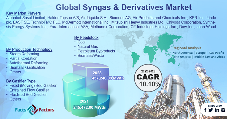 The global Syngas & Derivatives market size was valued at 245,472 MWth in 2021 and is expected to surpass 437,246.03 MWth by 2028, registering a CAGR of 10.10% during the forecast period (2022- 2028), as highlighted in a report published by Facts & Factors. The key market players are listed in the report with their sales, revenues and strategies are Alphabet Sasol Limited, Haldor Topsoe A/S, Air Liquide S.A., Siemens AG, Air Products and Chemicals Inc., KBR Inc., Linde plc, BASF SE, TechnipFMC PLC, McDermott International Inc., Mitsubishi Heavy Industries Ltd., and others.