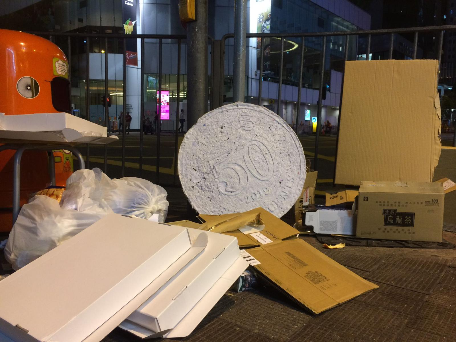 | The Coin Series: “1kgdp” “1kgdp” highlights the challenges faced by cardboard grannies during periods of economic instability. Inspired by the drop in street-recycled cardboard prices to HK$0.5 per kilogram in previous years, the design captures the impact of external factors such as China’s ban on importing certain types of waste and disruptions in Hong Kong’s wastepaper export industry. Each 50-cent coin weighs 1 kilogram and features a large-scale design with a diameter of 62 centimetres. Like its predecessor, it is crafted using three types of paper—cardboard, A4 paper, and newspaper. It symbolizes the ongoing struggles of the cardboard grannies and the precarious nature of their livelihoods. |