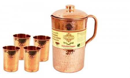 Indian Art Villa Handmade High Quality 100% Pure Solid Copper Hammered Jug Pitcher Volume 2.1 Liter with 4 Copper Hammered Glass Tumbler...
