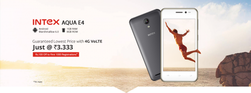 Intex launched the Cheapest 4G VoLTE Smartphone, Intex launched AQUA E4 for Rs.3,333/- in India.