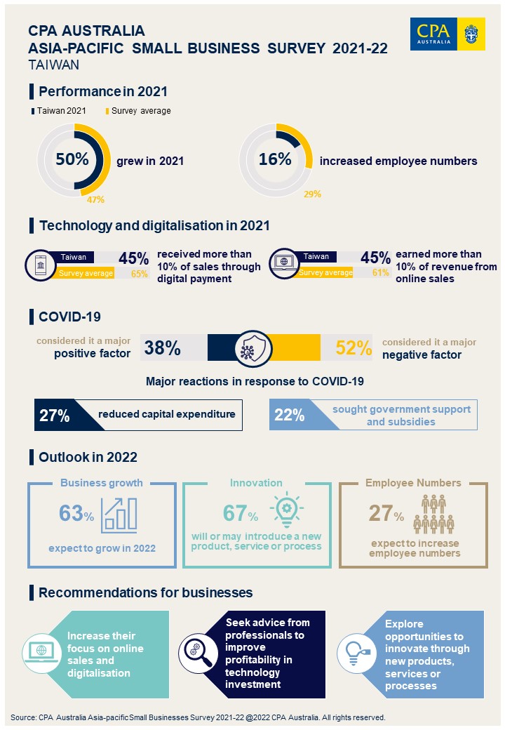 CPA Australia’s annual “Asia-Pacific Small Business Survey” surveyed 4,252 small business owners or senior managers across 11 Asia-Pacific markets, including 310 from Taiwan. Conducted from November to December 2021, the survey was designed to understand local business conditions, challenges and confidence.