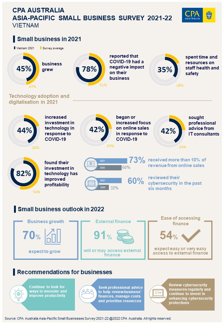 Dr. Can Van Luc, FCPA (Aust.) � Chief Economist of BIDV & President of BIDV Research and Training Institute, Chair of North Vietnam Advisory Committee – CPA Australia said, “While 2021 was a difficult year, 45 per cent of Vietnamese small businesses still managed to grow. Under the government’s dual goals of ‘preventing the pandemic and promoting socio-economic recovery’, inflow of foreign direct investment has grown steadily over the past year (up by 9.2 per cent in 2021). Recovering domestic and overseas demand, together with government policy support, have bolstered small businesses operations and accelerated their digital transformation.”