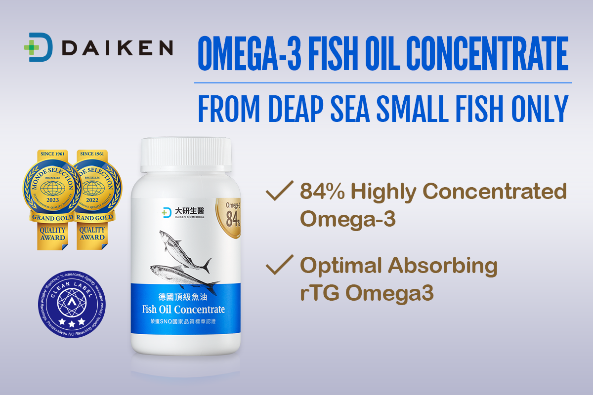 Dr. David CC Yang, a renowned surgeon in Taiwan, strongly recommends Daiken Fish Oil Concentrate. Daiken Biomedical has collaborated with KD Pharma, the world’s leading pharmaceutical-grade Omega-3 manufacturer, to carefully select high-quality small fatty fish from the coasts of Chile and Peru for the patented extraction of highly concentrated fish oil in rTG form, guaranteeing over 84% of Omega-3 fatty acids in the fish oil. Its concentration level raises up to an incredible 97.7% upon third-party testing. After passing the most stringent and rigorous evaluation, Daiken Fish Oil Concentrate has been awarded the Monde Selection’s Grand Gold Quality Award, certified by the A.A. Clean Label with a three-star rating, and the IFOS with a five-star rating for its high purity, edible ease, and small size. This dietary supplement is an excellent and safe choice for anyone seeking to maintain their health and protect brain functions. It comes highly recommended for families and friends alike.