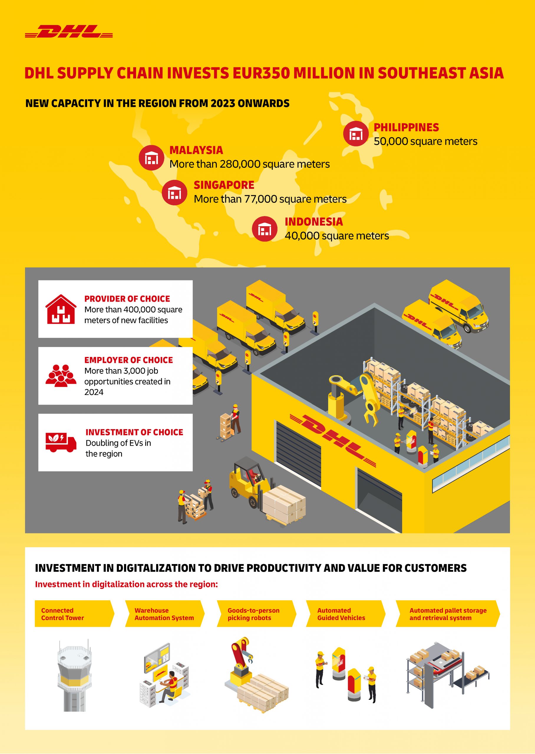 With this investment, DHL Supply Chain will increase its current 1.6 million square meters of warehouse space in Southeast Asia by 25 percent, or 400,000 square meters. Highlights of this investment include: