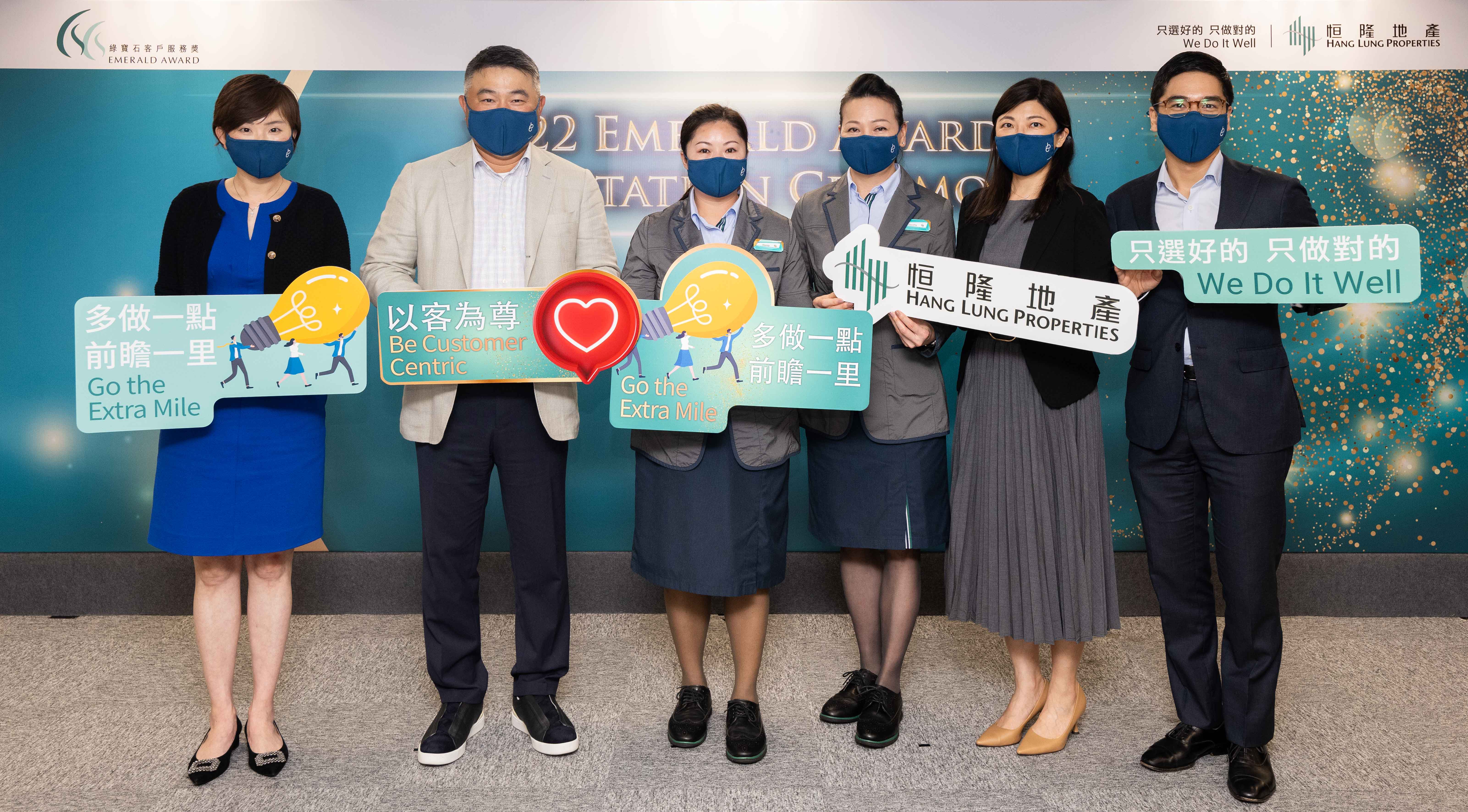 Mr. Adriel Chan, Vice Chair (1st from the right), Mr. Weber Lo, Chief Executive Officer (2nd from the left) and senior management of Hang Lung Properties attend the 2022 Hang Lung Emerald Award presentation ceremony to commend frontline staff winners for upholding the service philosophy of customer-centric even amid the pandemic