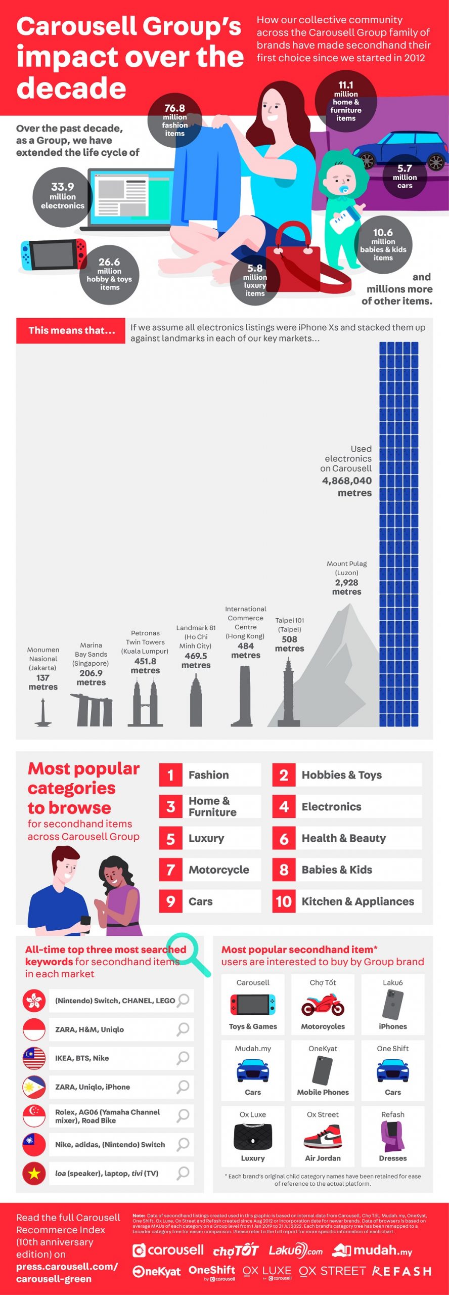 Over the past decade, Carousell Group’s users have extended the life cycle of millions of items, including: 76.8 million fashion items; 33.9 million electronics; 26.6 million hobby items and toys; 11.1 million home items and furniture; and 10.6 million babies & kids items.
