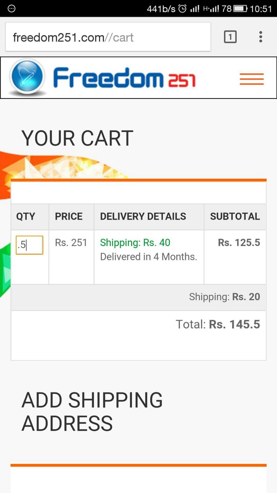 Once you add the Freedom 251 Smartphone to your cart and enter all the shipping details and once you click on submit the same page reloads with all the fields blank. Most of the users were not able to book their Mobile.