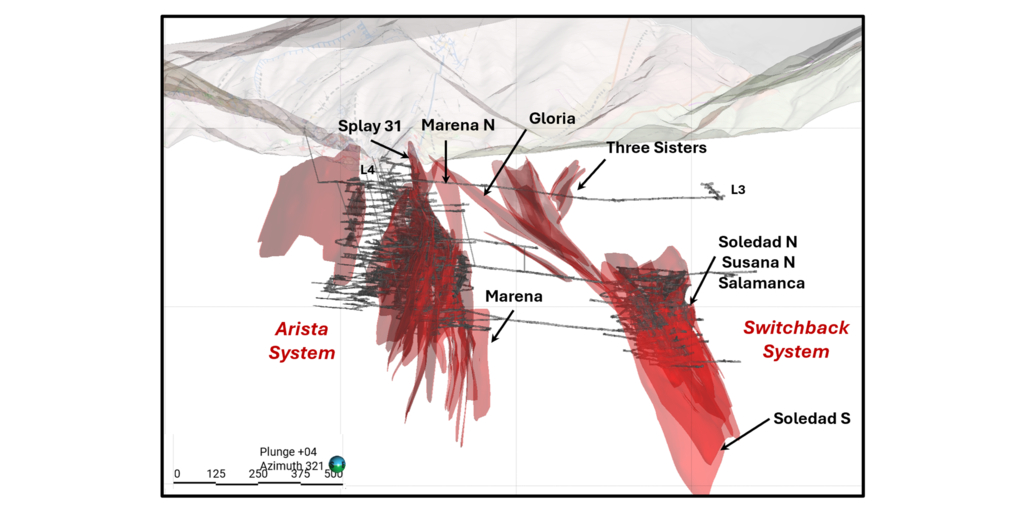 Drilling continues to identify significant ore-shoots within the newly defined inferred resource shells of veins in the Gloria / Three Sisters vein system, where positive results and recent geologic interpretation have defined a robust mineralized horizon between approximately 650 and 750 m ASL, where the Gloria and Three Sisters veins merge. This horizon appears to be extending upwards, highlighted by the recent results from Hole No. 523136, intersected at an elevation of 762 m ASL. The Gloria / Three Sisters vein system continues to remain open in all directions.