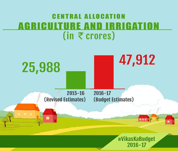 Shri Arun Jaitley said that out of 141 million hectares of net cultivated area only about 65 million hectares are irrigated. In this regard, he announced Pradhan Mantri Sinchai Yojana, to be implemented in a mission mode to bring another 28.5 lakh hectares under irrigation. He said that 89 projects under AIBP will be fast tracked which will help to irrigate another 80.6 lakh hectare. He promised to complete 23 of these projects before 31st March, 2017. These projects require Rs.17,000 crores next year and Rs. 86,500 crore in the next five years.