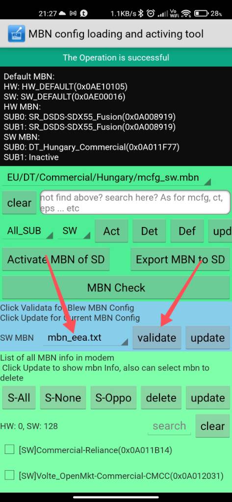 Open Modem test tools by using *#*#663368378#*#* code in dialer > Open MBN config loading and activating tool > select mbn_eea.txt for SW MBN > tap on validate > wait some secs for update.