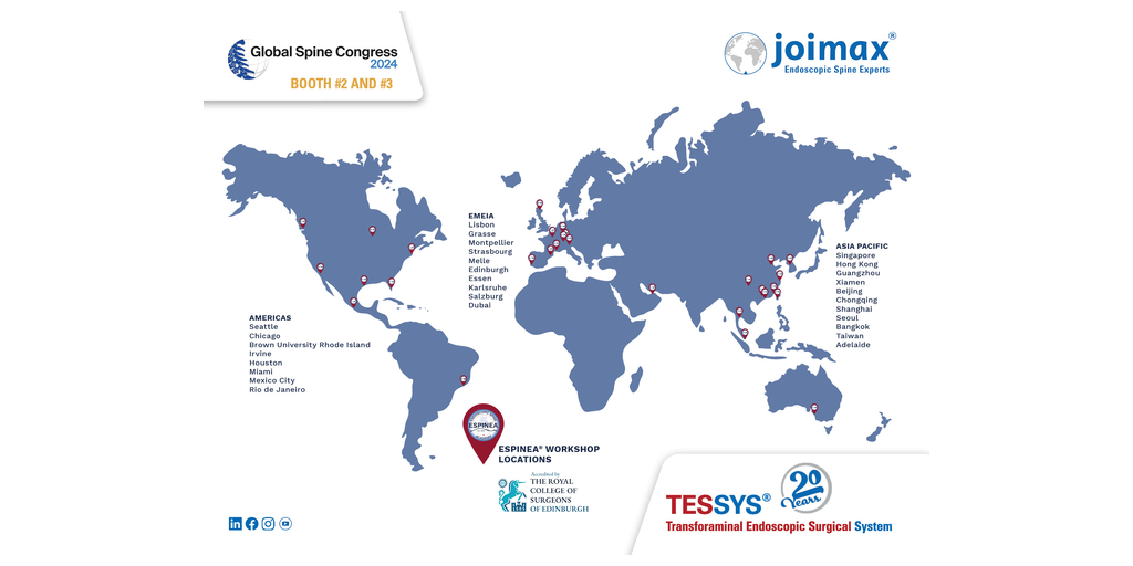KARLSRUHE, Germany–(BUSINESS WIRE)–#endoscopic–German-based joimax®, the market leader in technologies and training methods for full-endoscopic and minimally invasive spinal surgery, announces the launch of its new website alongside a significant presence at the Global Spine Congress (GSC) in Bangkok, May 15 – 18. This dual celebration marks a pivotal moment for the company as it showcases its latest product innovations and commemorates two decades of excellence with TESSYS®, a pioneering technique that has revolutionized endoscopic spine surgery.