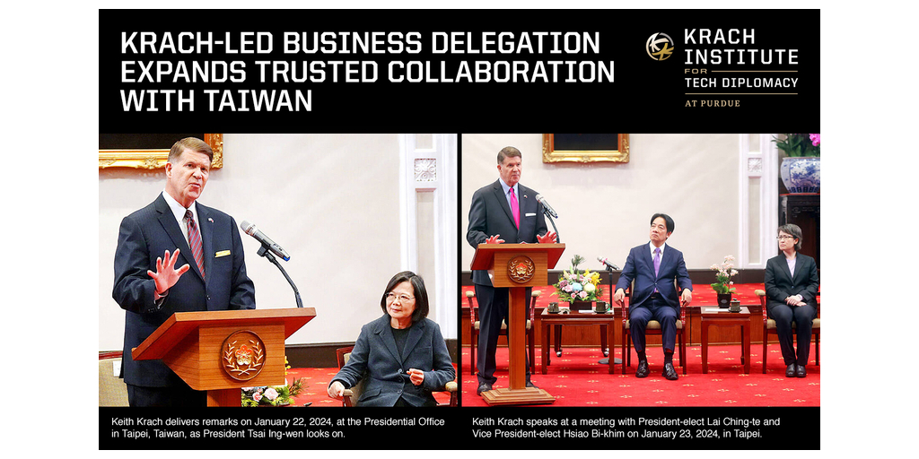 In recognition of Taiwan’s vibrant democratic process, the USTBC delegation also met with leaders from all political parties in Taiwan to gain a firmer understanding of the challenges facing the Taiwanese people and the diverse perspectives of Taiwan’s decision makers. Finally, Chairman Krach had discussions with National Yang Ming Chiao Tung University (NYCU) President Lin Chi-hung and National Chengchi University (NCCU) President Li Tsai-yen and their leadership teams focused on expanding their cooperation to drive the innovation and adoption of trusted technology. The Krach Institute for Tech Diplomacy at Purdue and both NYCU and NCCU signed Memorandums of Understanding in 2023 aimed at joint research, training, and tech diplomacy leadership.