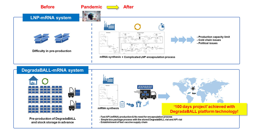 In terms of timely and effective pandemic response, mRNA vaccines have an advantage over antigen protein vaccines because they can be developed more rapidly. However, effective delivery of mRNA in the body requires drug delivery technology. The LNP that is currently applied to existing mRNA vaccines has shown limitations, such as safety concerns including anaphylaxis, myocarditis, and pericarditis, as well as the need for an ultra-low-temperature cold chain. Therefore, there is a need for next-generation drug delivery technology. The drug delivery technology of DegradaBALL developed by Lemonex may address these issues, suggesting a more advanced DDS technology for mRNA vaccines and therapeutics.