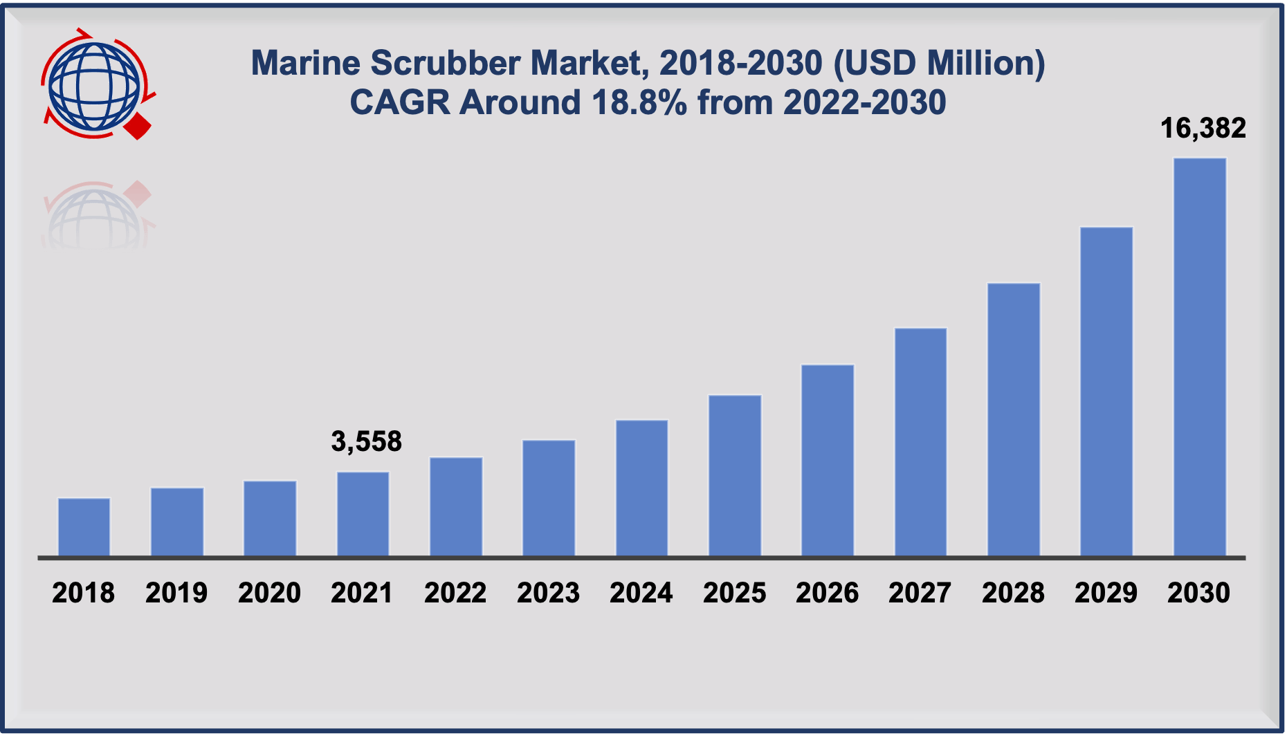 Seattle, Aug. 24, 2022 (GLOBE NEWSWIRE) — The global marine scrubber market size accounted for USD 3,558 Million in 2021 and is estimated to achieve a market size of USD 16,382 Million by 2030, growing at a CAGR of 18.8% from 2022 to 2030.
