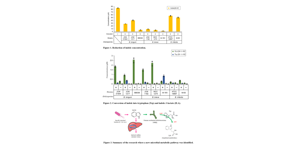 - Metabolic Pathway Elucidation: The study identified a new microbial metabolic pathway involving tryptophan synthase β subunit (TrpB) and aromatic lactate dehydrogenase (ALDH) in the conversion process (Figure 3). The researchers confirmed that selected bifidobacterial strains, including Morinaga Milk’s HRB strains can efficiently transform exogenous indole into ILA and Trp. This elucidation of the metabolic pathway provides a detailed understanding of the biochemical processes involved, highlighting the sophisticated mechanisms by which bifidobacteria contribute to gut health.