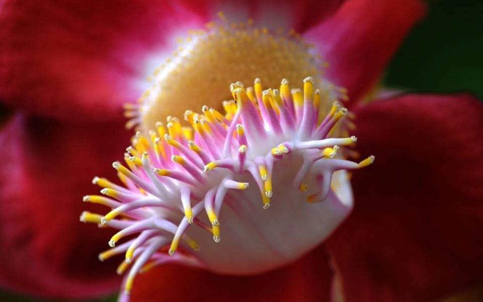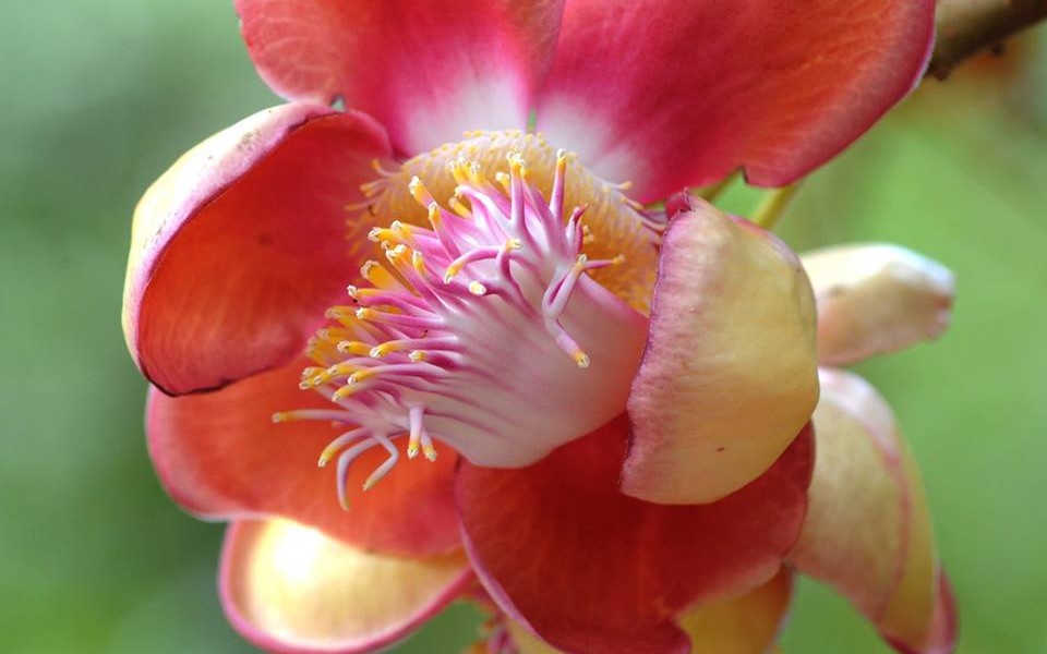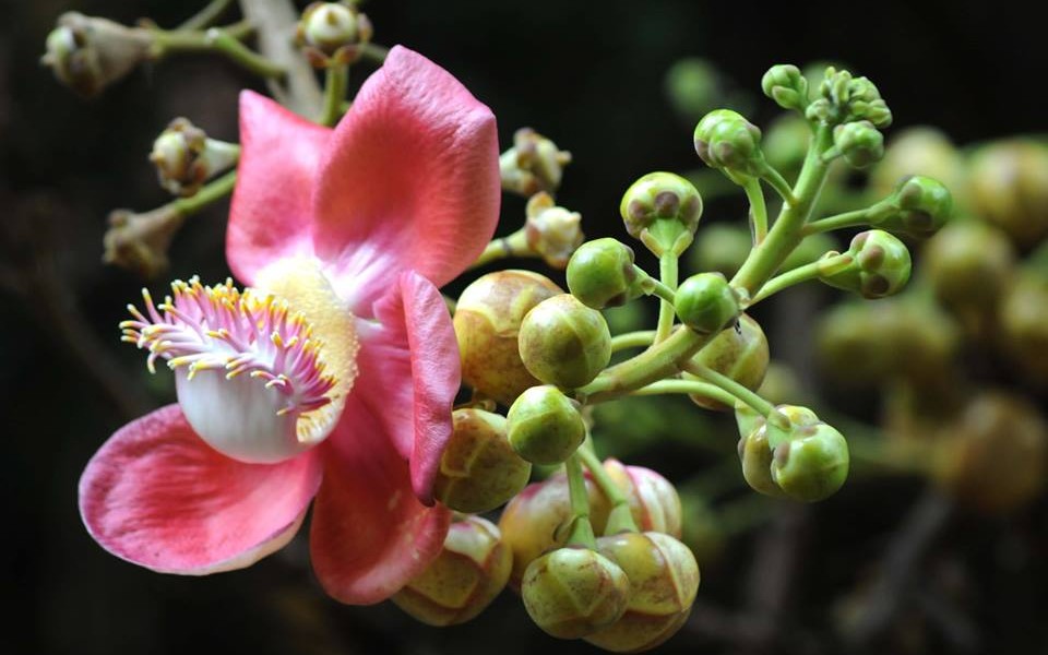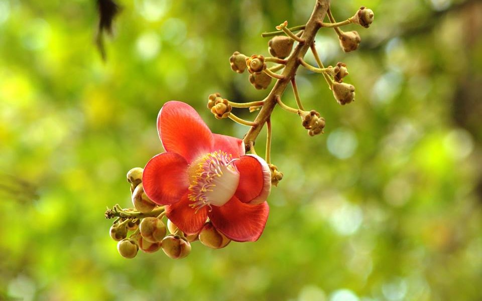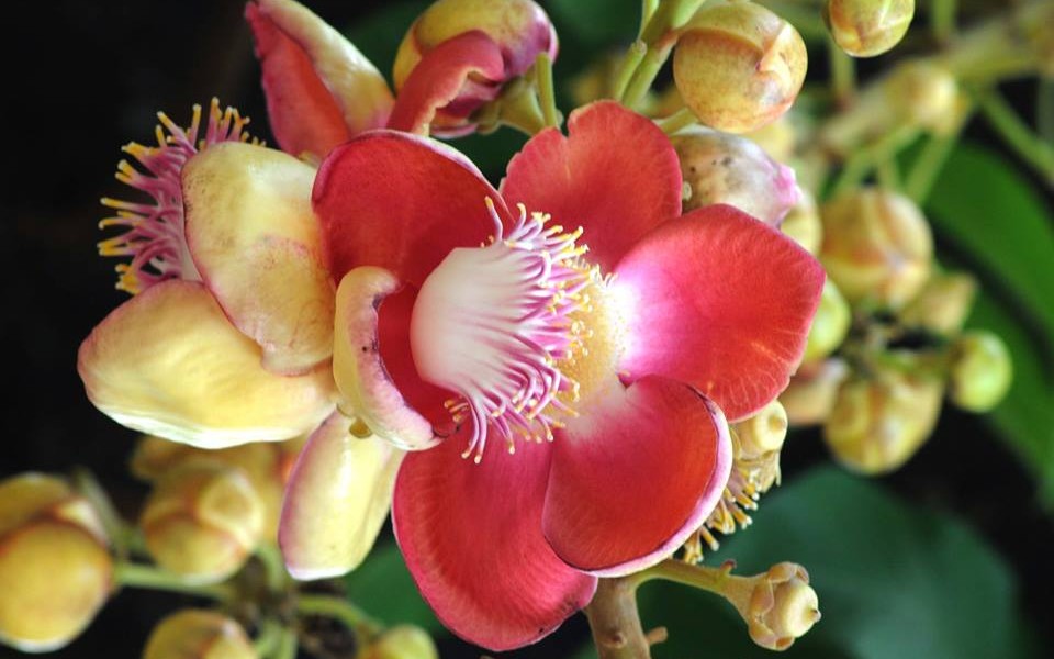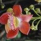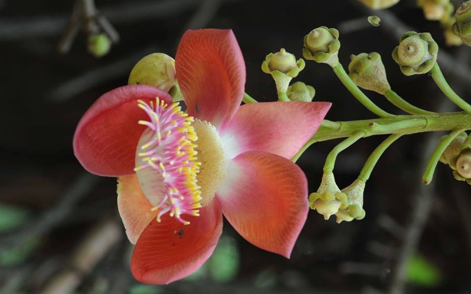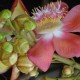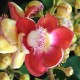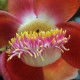 Cannonball tree grows up to 35 m (meters) in height. The clustered leaves vary in length, generally from 8 to 31 centimeters, but reaching up to 57.The flowers are born in large bunches up to 80 m(meters) long. Some trees flower profusely, until the entire trunk is buried in flowers. One tree can bear 1000 flowers per day. They are strongly scented, especially at night,and in the early morning.They are large, up to 6 centimeters wide, and often brightly colored, the six petals in shades of pink and red near the bases and yellowish toward the tips. There is a ring of stamens at the center, and an arrangement to stamens that have been modified into a hood.The large fruit, which is woody and very spherical, measuring up to 25 centimeters wide, gives the species the common name “cannonball tree”. A smaller fruit contains perhaps 65 seeds, while a large one can have 550.One tree can bear 150 fruits. The fruit takes up to a year to mature in most areas, sometimes as long as 18 months.
