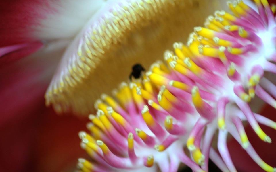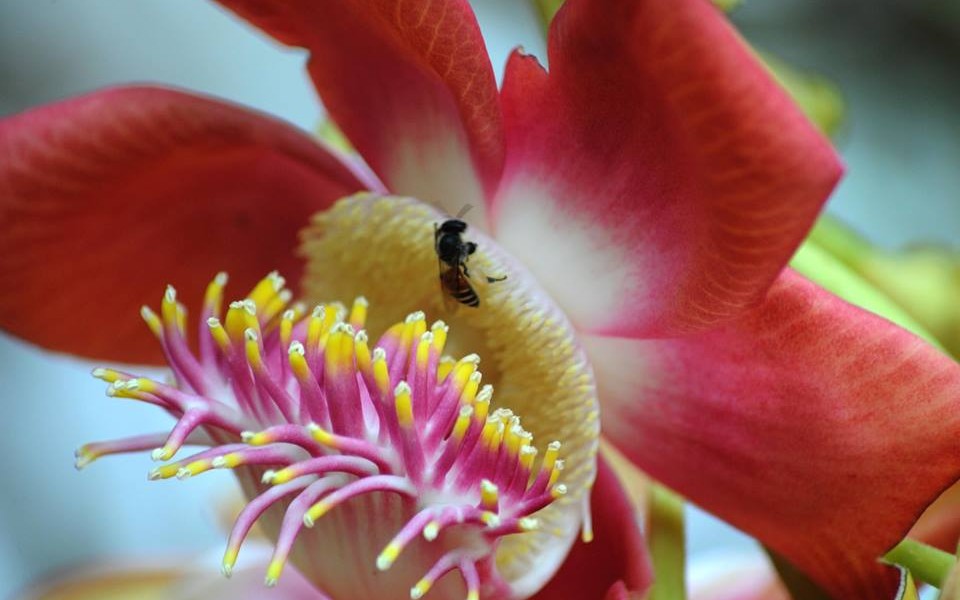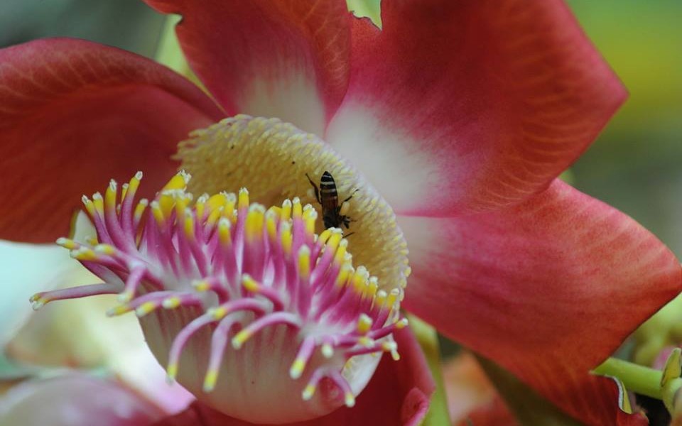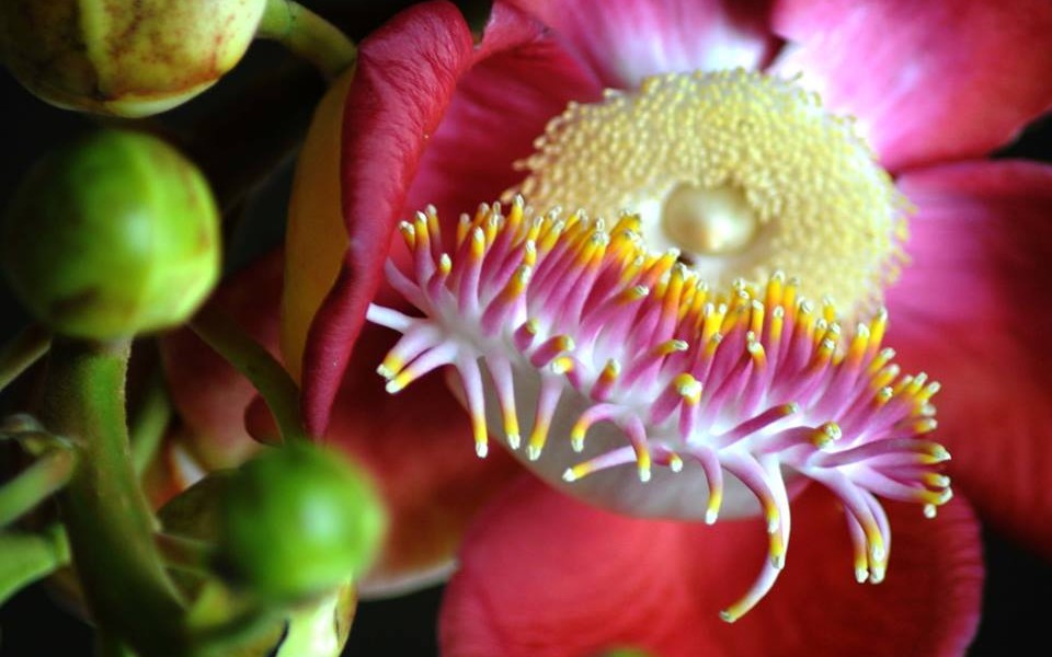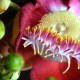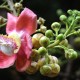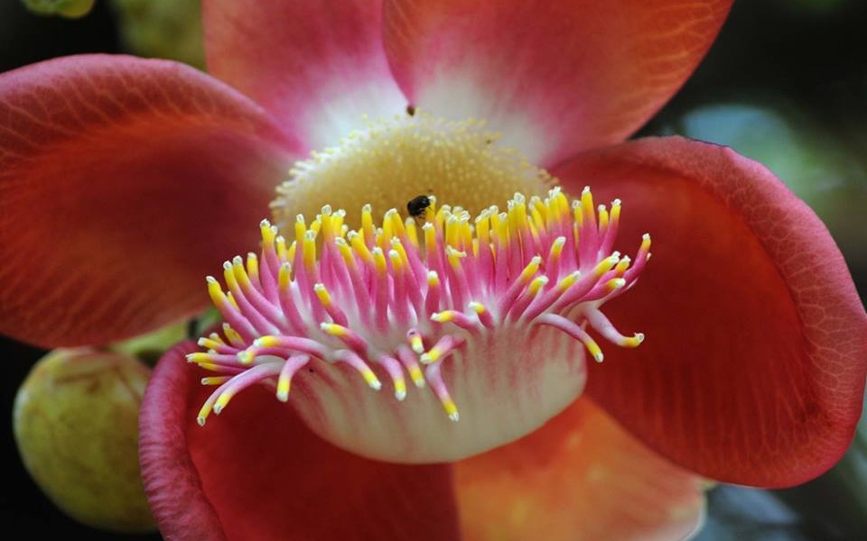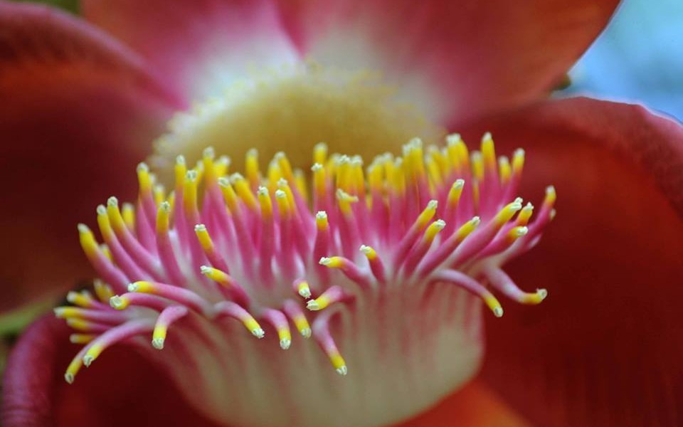 Cannonball tree grows up to 35 m (meters) in height. The clustered leaves vary in length, generally from 8 to 31 centimeters, but reaching up to 57.The flowers are born in large bunches up to 80 m(meters) long. Some trees flower profusely, until the entire trunk is buried in flowers. One tree can bear 1000 flowers per day. They are strongly scented, especially at night,and in the early morning.They are large, up to 6 centimeters wide, and often brightly colored, the six petals in shades of pink and red near the bases and yellowish toward the tips. There is a ring of stamens at the center, and an arrangement to stamens that have been modified into a hood.The large fruit, which is woody and very spherical, measuring up to 25 centimeters wide, gives the species the common name “cannonball tree”. A smaller fruit contains perhaps 65 seeds, while a large one can have 550.One tree can bear 150 fruits. The fruit takes up to a year to mature in most areas, sometimes as long as 18 months.