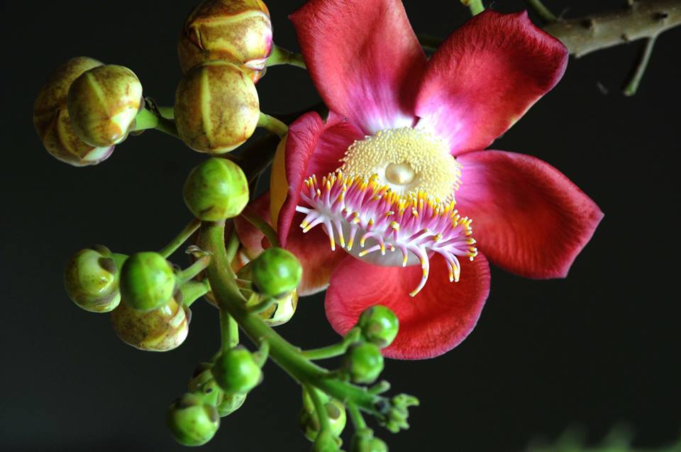 Cannonball tree grows up to 35 m (meters) in height. The clustered leaves vary in length, generally from 8 to 31 centimeters, but reaching up to 57.The flowers are born in large bunches up to 80 m(meters) long. Some trees flower profusely, until the entire trunk is buried in flowers. One tree can bear 1000 flowers per day. They are strongly scented, especially at night,and in the early morning.They are large, up to 6 centimeters wide, and often brightly colored, the six petals in shades of pink and red near the bases and yellowish toward the tips. There is a ring of stamens at the center, and an arrangement to stamens that have been modified into a hood.The large fruit, which is woody and very spherical, measuring up to 25 centimeters wide, gives the species the common name “cannonball tree”. A smaller fruit contains perhaps 65 seeds, while a large one can have 550.One tree can bear 150 fruits. The fruit takes up to a year to mature in most areas, sometimes as long as 18 months.