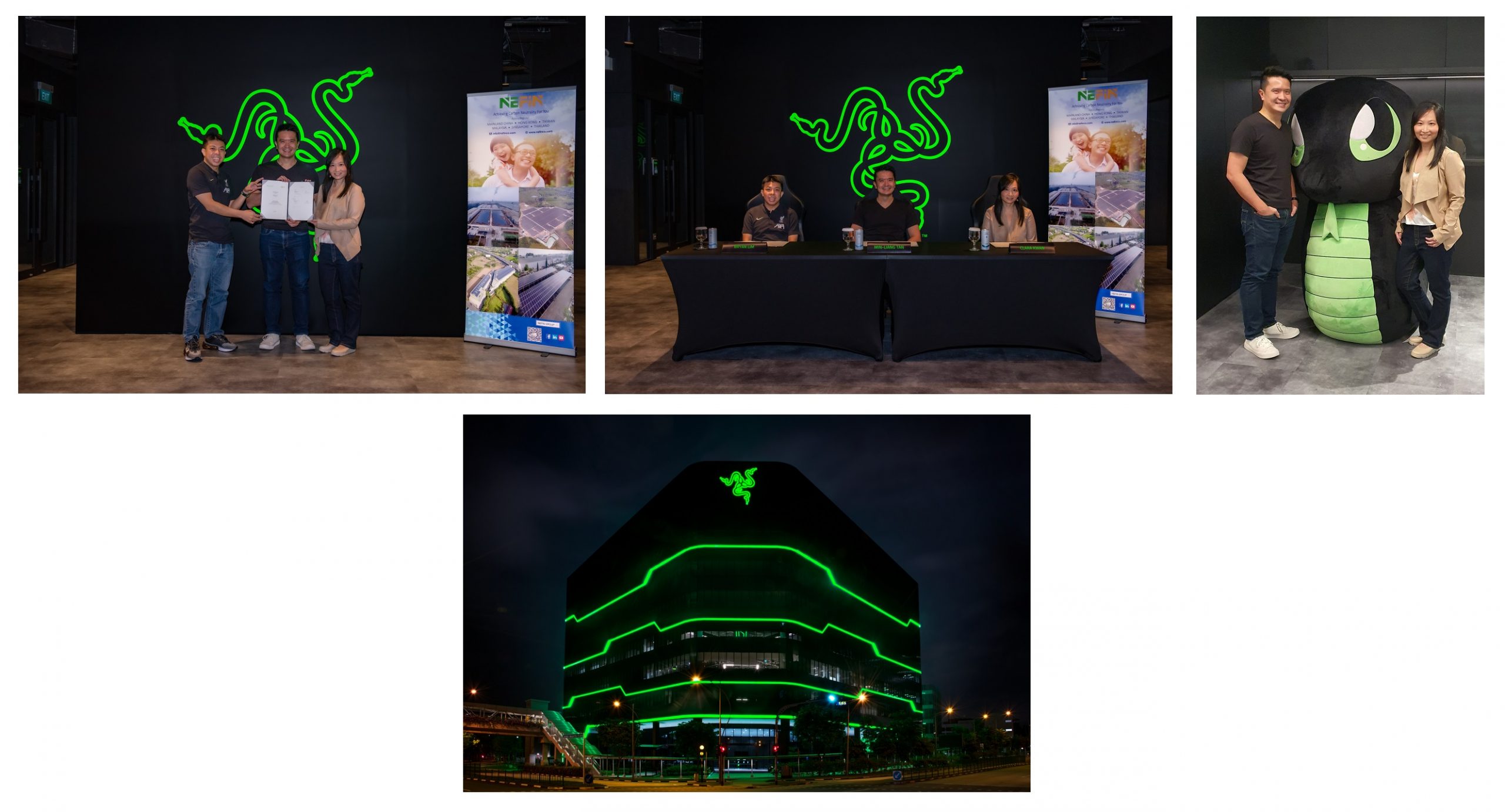 Top-left & Center: Signing Ceremony with [from left] Mr. Bryan Lim, Managing Director of Echo Base, Mr. Min-Liang Tan, CEO and co-founder of Razer, & Ms Clara Kwan, COO of NEFIN Group.