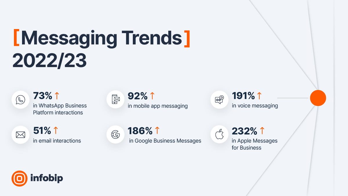 Customers have access to more channels and devices than ever before. Infobip’s analysis shows that traditional channels like SMS still play an important role for time-sensitive messages, two-factor authentication, and one-time passwords. But when it comes to engagement and support, customers are shifting to more conversational experiences over chat apps.