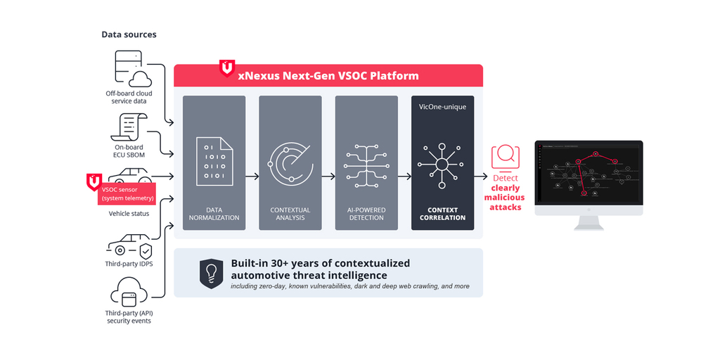 DALLAS & TOKYO–(BUSINESS WIRE)–VicOne, an automotive cybersecurity solutions leader, today announced the xNexus next-generation vehicle security operations center (VSOC) platform. The new solution integrates with VicOne’s in-vehicle VSOC sensor, leveraging a unique Large Language Modeling (LLM) approach to provide customized reporting to support VSOC teams. xNexus can provide product security incident response teams (PSIRTs) or engineering teams with actionable and contextualized attack intelligence based on the needs of different stakeholders. The capabilities delivered by the new VicOne solution accelerate threat investigations, enable confident response to attacks and effectively reduce the burden of chasing inexplicable false alarms.