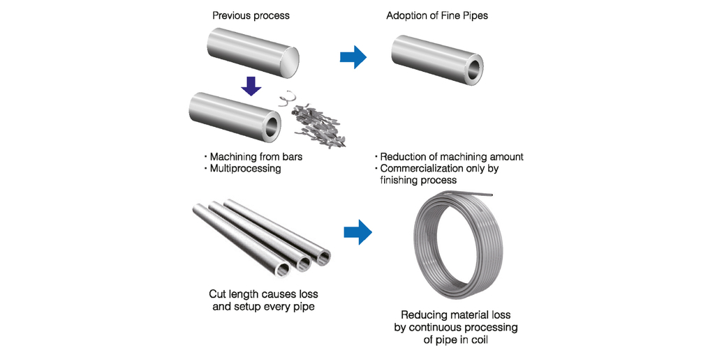Fine pipes are high-quality and extremely reliable, and therefore have a key role in automotive components such as fuel pipes and sensor components. Additionally, they meet wide range specification such as Thick-walled tube for high pressure (OD: less than 20mm, thickness: Maximum 2.0mm), Heat-resistant alloys for high-temperature applications (SUS310S, Inconel601 etc.) based on long-time know-how as the materials manufacture.