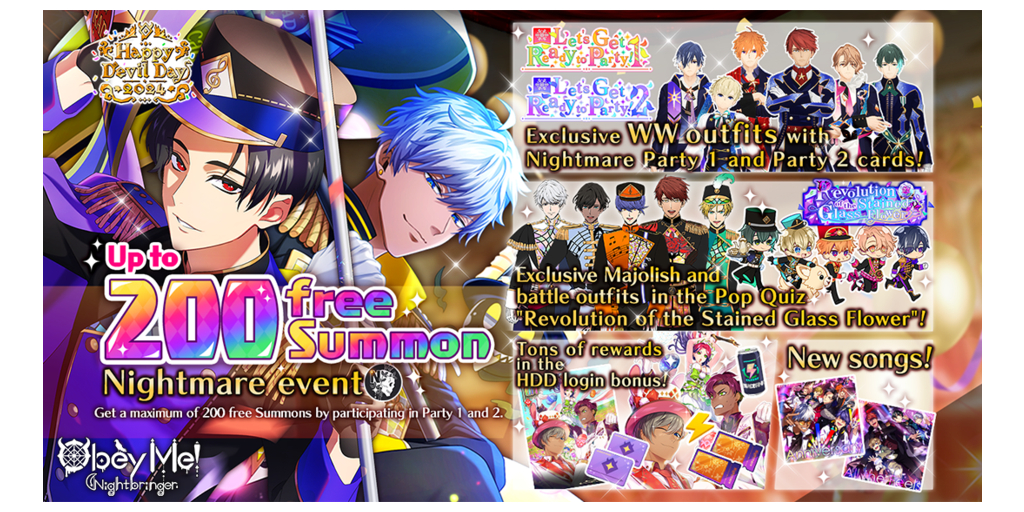 There will be a login bonus with exclusive Happy Devil Day 2024 Exchange Tickets. Users who collect the tickets will be able to exchange them for a card of their choice from the Nightmare events “Let’s Get Ready to Party!” Vol. 1 & 2!