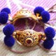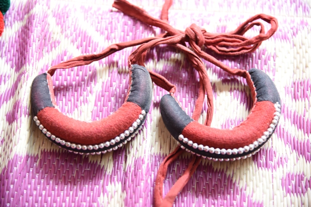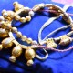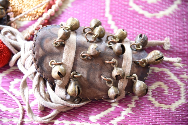 The jewelry includes necklace, bracelets, bangles, gold colored breastplates and a bunch of tiny bells tied to each ankle.
